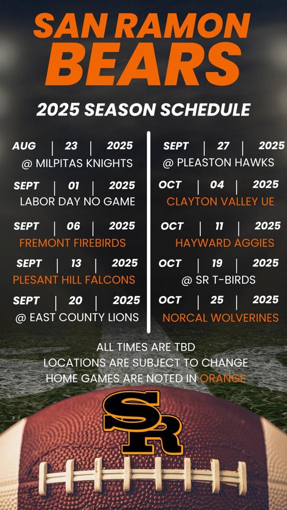 Welcome to the home of the San Ramon Bears Youth Football and Cheer Organization! We hope that you are considering joining us and becoming part of our "Bears Family". Please look around the website learn more by clicking on the "About Us" tab. For our Bears Family that are returning, welcome back! We are preparing for another great season. Registration for the 2025 Season is OPEN,. Check back soon for Spring Football Camps and Clinics! Dont forget to check us out on Instagram.